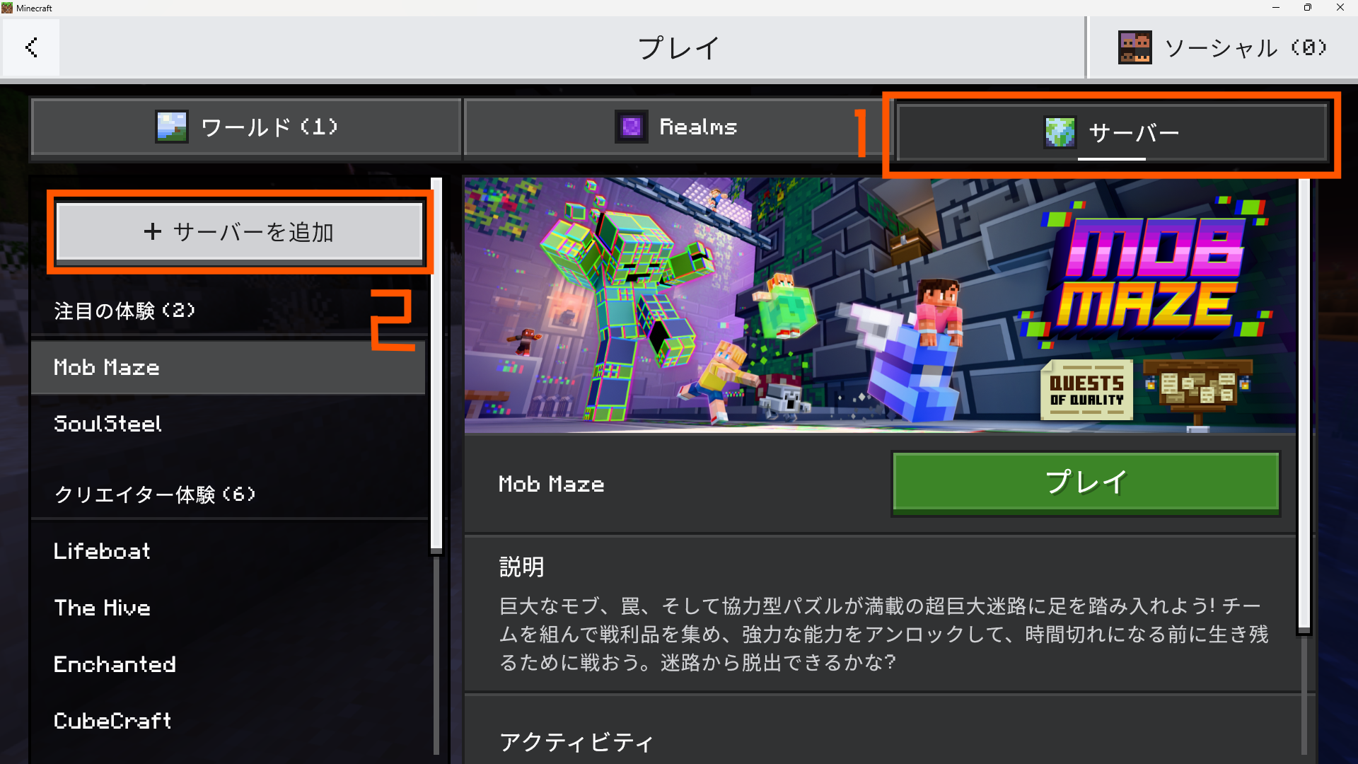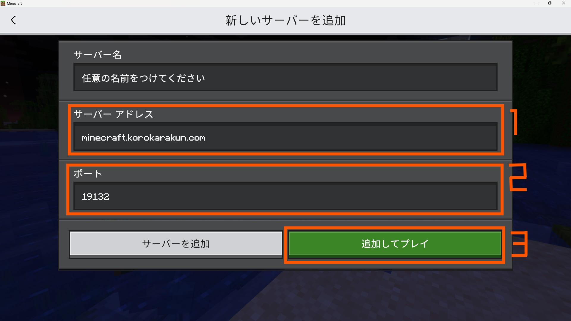⑤ サーバーアドレス:minecraft.korokarakun.com
