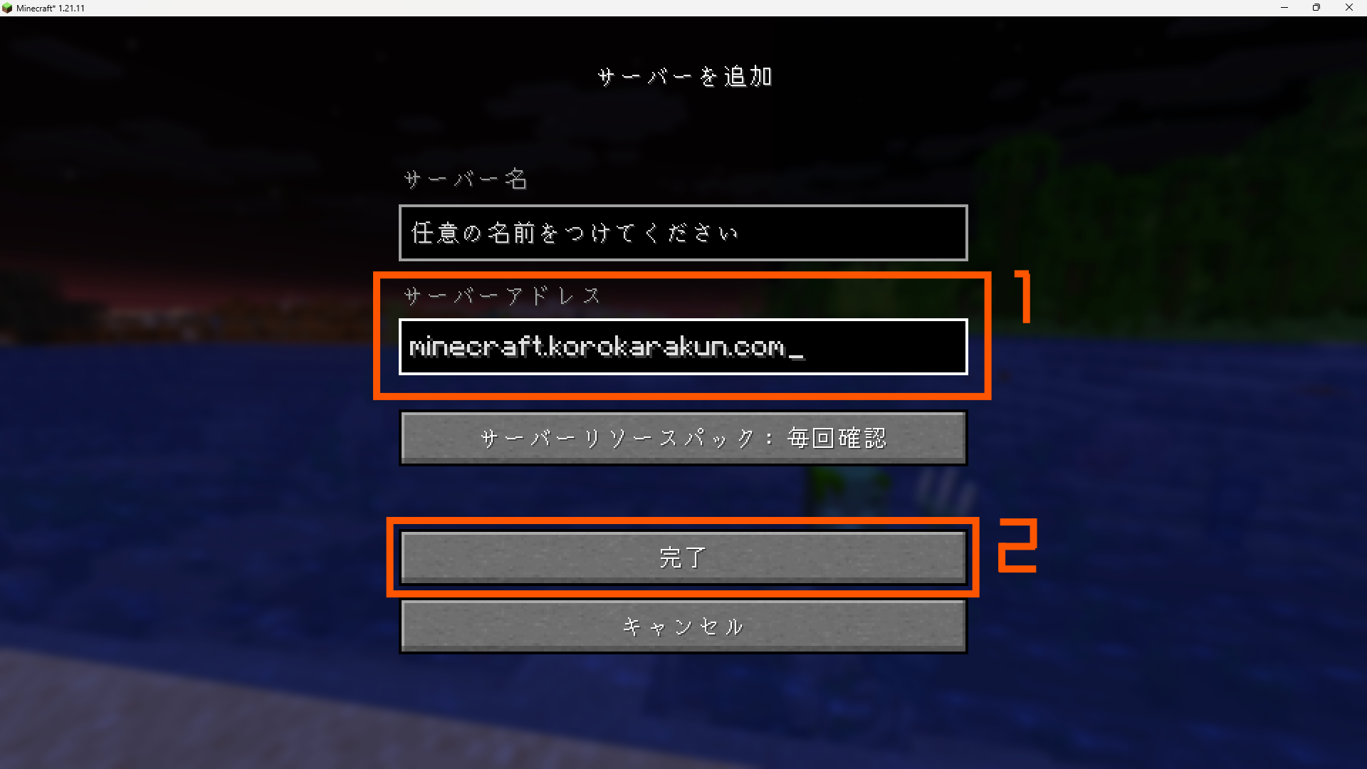 ⑤ サーバーアドレス:minecraft.korokarakun.com